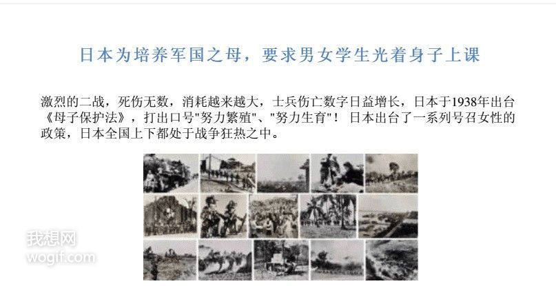 激烈的二戰(zhàn),死傷無數(shù),消耗越來越大,士兵傷亡數(shù)字日益增長,日本于1938年出臺《母子保護(hù)法》,打出口號"努力繁殖"、"努力生育"!日本出臺了一系列號召女性的政策,日本全國上下都處于戰(zhàn)爭狂熱之中。